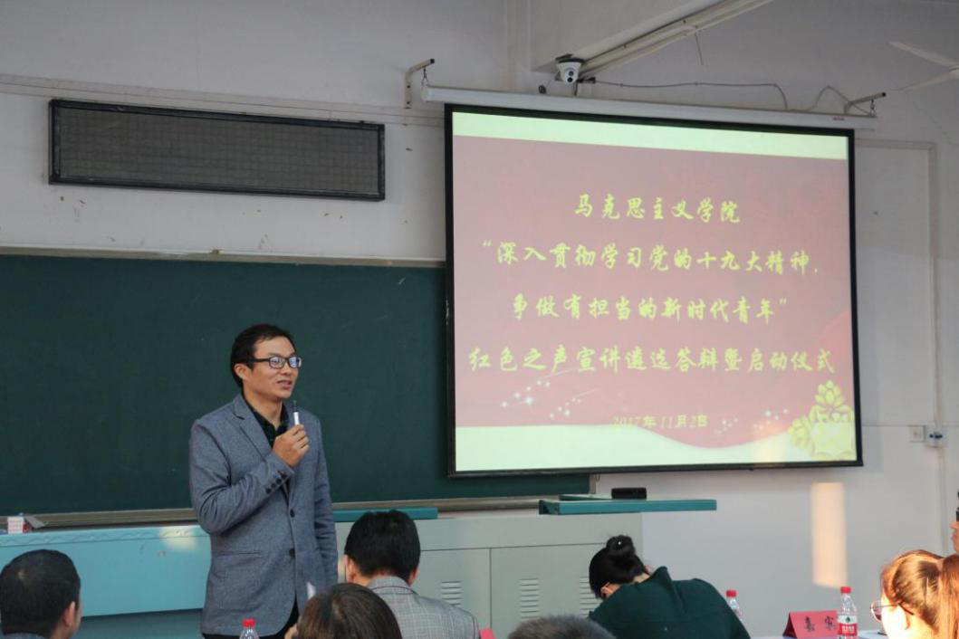 最后,学院党委书记侯志军老师总结讲话。他指出学院“红色之声”宣讲活动有很高的政治价值和很好的实践价值、人才培养价值,“红色之声”宣讲是“学懂、弄通、做实”党的十九大精神的重要载体。同时,侯书记对参加宣讲的同学提出要求,一是要做好角色定位,要始终按照中央要求,以学生喜闻乐见的方式进行理论宣传;二是要提高能力,在宣讲过程中提升学习能力、研究能力和表达能力。三是要实干。在实现“两个一百年”和“中国梦”的伟大进程中勇于奋斗,勇于创新,争当“有理想、有本领、有担当”的新时代青年,成为中国特色社会主义的合格建设者和可靠接班人。
