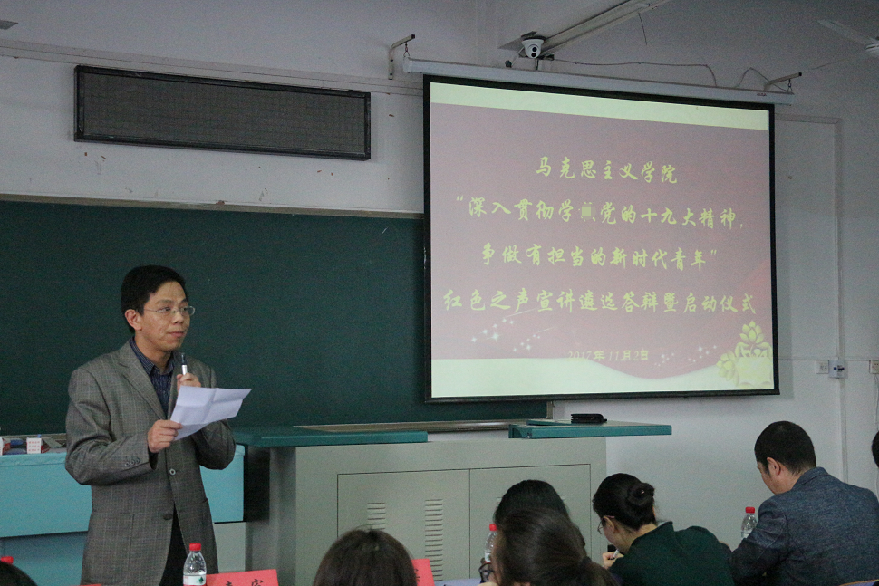 11月2日下午13点,马克思主义学院“红色之声”宣讲(第八期)启动仪式暨遴选答辩会在教三楼501室举行,主题为“深入学习贯彻党的十九大精神,争做有担当的时代青年”。马克思主义学院院长高翔莲老师、院党委书记侯志军老师、学校党委学工部副部长张建和老师、校党委研工部副部长陈慧老师、学院党委副书记黄少成老师、校团委霍少孟老师、学院团委书记王艳波老师以及兼职辅导员董树婷学姐应邀担任本次活动的评委嘉宾。学院党委副书记黄少成老师主持启动仪式。