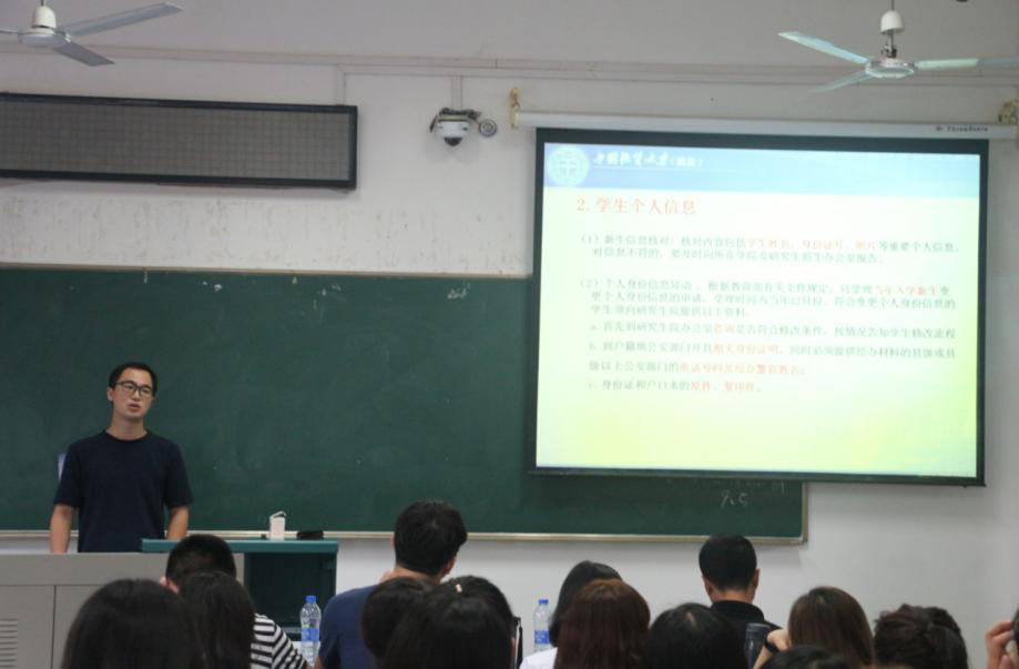 随后,高年级博士研究生代表曹阳同学就入学准备、专业学习、奖助贷三个方面向新生进行详细介绍,指导和帮助2017级研究生更快适应新的学习生活。