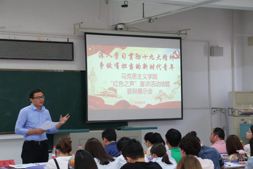 5月3日下午14:30,马克思主义学院“红色之声”宣讲(第八期)结题答辩展示会于教三楼301教室举行。马克思主义学院党委书记侯志军老师、学校党委学工处副处长张建和老师、校党委研工部副部长陈慧老师、校团委副书记姜明敏老师、院党委副书记黄少成老师以及院团委书记王艳波老师应邀担任本次活动的评委嘉宾。
