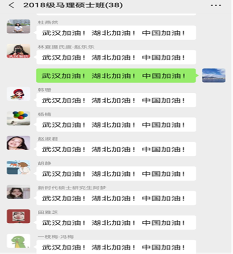 新型冠状病毒肺炎疫情爆发以来,在以习近平总书记为核心的党中央领导下,全国人民万众一心,立志打赢这场疫情防控阻击战!面对疫情蔓延的严峻情势,马克思主义学院积极响应校党委学工部号召,在硕士生各年级开展“同心抗疫,共克时艰”线上新冠肺炎疫情防控主题班会,坚持思想引领,强化责任担当,引领马院同学理性、正确对待疫情,不断深化爱国主义教育,为坚决打赢这场没有硝烟的疫情防控阻击战贡献青春力量。