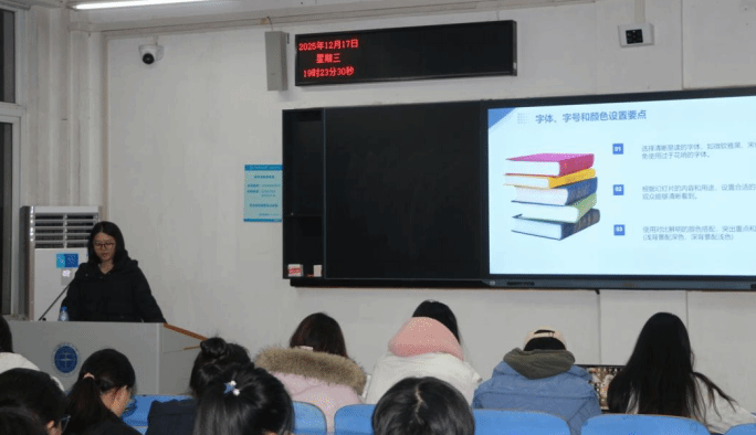 而后,办公室副主任杨燚就如何美化ppt这一主题进行分享。她简要说明ppt在学生工作中起到的重要作用,紧接着通过界面与功能区域、输入和编辑文本内容方法、字体字号颜色设置、数据编辑与样式调整、幻灯片背景填充等角度细致说明美化ppt内容的方法。