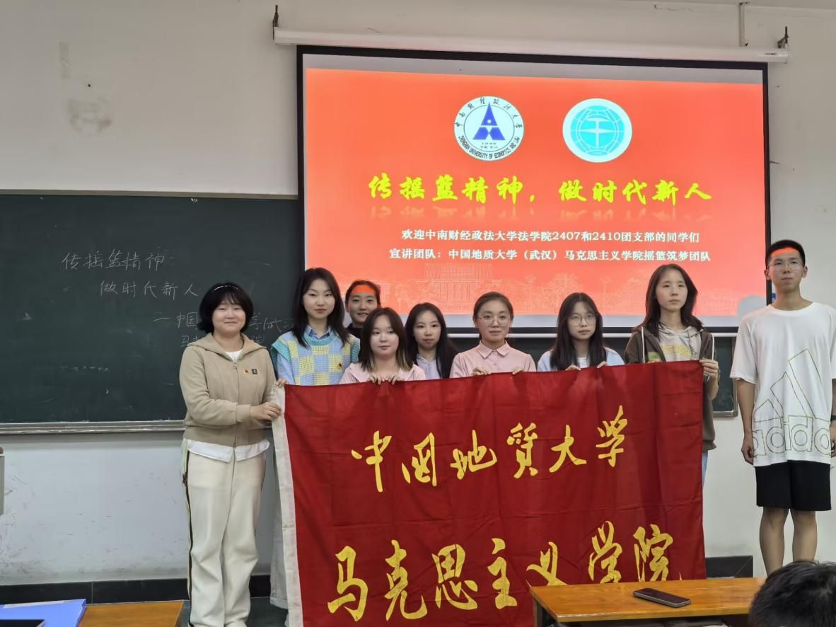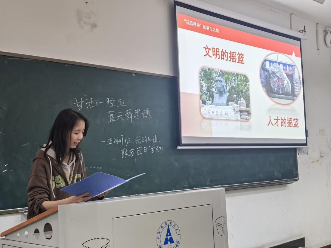 2024年11月14日16点20分,马克思主义学院第十五期红色之声“摇篮筑梦”团队在线下进行了主题为“生命安全主题教育”、“甘洒一腔血,蓝天舞忠魂”和“传摇篮精神,做时代新人”的线下宣讲,团队成员郭雅婕、李瑞雪、席海冰、辛汪洋、朱一婷担任主讲人,中南财经政法大学法学院2407和2410团支部参与本次活动,共计116名同学。