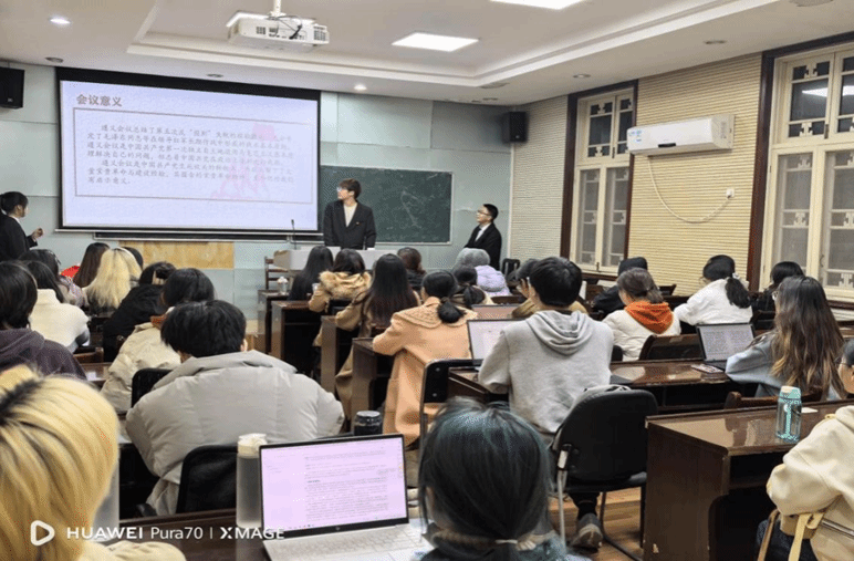 紧接着进入宣讲的第二部分,重点结合青春奋进“与”创新驱动“话题进行展开。吴妮珊同学通过具体讲述遵义会议故事揭示了遵义会议精神,并结合二十届三中全会的主题阐释了敢闯新路精神对于“青春奋进新征程,创新驱动促复兴“的必要性。