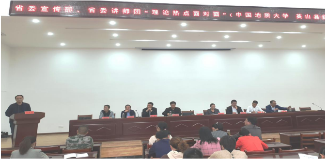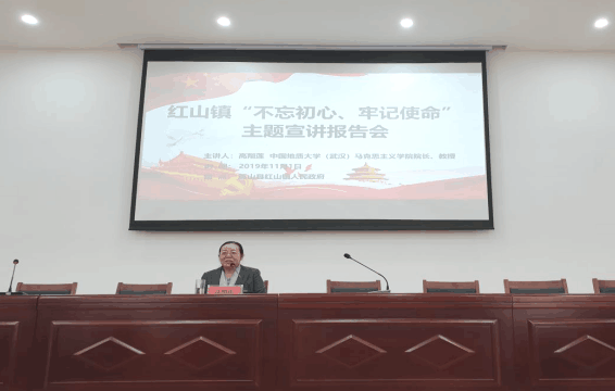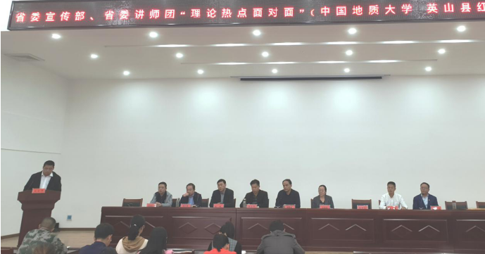 (通讯员孙东震)2019年11月1日,省委宣传部、省委讲师团、中国地质大学“理论热点面对面”示范点授牌仪式暨“不忘初心牢记使命”主题教育宣讲报告会在黄冈市英山县红山镇党员群众活动中心隆重举行。省委讲师团调研员胡秋春、姚官华,英山县宣传部副部长胡天堂,我校党委宣传部副部长陈华文、马克思主义学院院长高翔莲教授、副院长阮一帆教授、办公室主任胡雪黎,红山镇党委书记陈琼、镇宣传委员徐新生等参加授牌仪式。该镇党员干部和部分群众代表约100人聆听了主题报告并参加授牌仪式。活动由徐新生宣传委员主持。