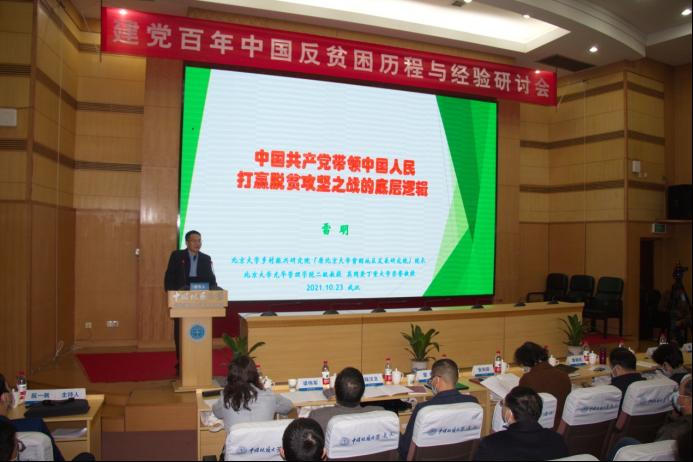 10月23日,建党百年中国反贫困历程与经验研讨会在南望山校区迎宾楼举行。国家乡村振兴局中国扶贫发展中心主任黄承伟,湖北省社会科学联合会党组书记、常务副主席喻立平、副主席安向荣,华中师范大学资深教授徐勇,校党委书记黄晓玫,公共管理学院院长胡守庚,科学技术发展研究院副院长郭海湘,马克思主义学院院长阮一帆,来自北京大学、中国人民大学、北京师范大学、中国农业大学、西安交通大学、华中师范大学、华中农业大学和中南财经政法大学等的专家学者,《江汉论坛》、新华社、《光明日报》、《中国社会科学报》等媒体以及我校马克思主义学院师生代表150余人参加研讨会。