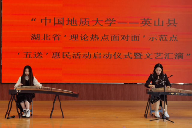 启动仪式后,“五送”惠民活动之“送文化”文艺汇演拉开序幕。阮一帆代表我校向红山镇及中学赠书。文艺汇演由艺术与传媒学院余敏、余磊等10余名师生与红山镇联合举办。《祖国慈祥的母亲》《我爱你中国》《父老乡亲》等歌曲响遏行云,唱出了对祖国母亲的深深眷恋和跟党走的坚定信念;古筝、笛子、独弦琴、二胡等传统乐器余音缭绕,绽放了非物质文化遗产的独特魅力;红山镇群众的互动节目广场舞表演将活动气氛推向了高潮。文艺汇演在我校师生合唱的《勘探队员之歌》中落下帷幕。一首首激昂的歌曲、一段段优美的管弦乐吸引着观众,赢得了阵阵掌声,为红山镇群众带来了一场精神文化盛宴。
