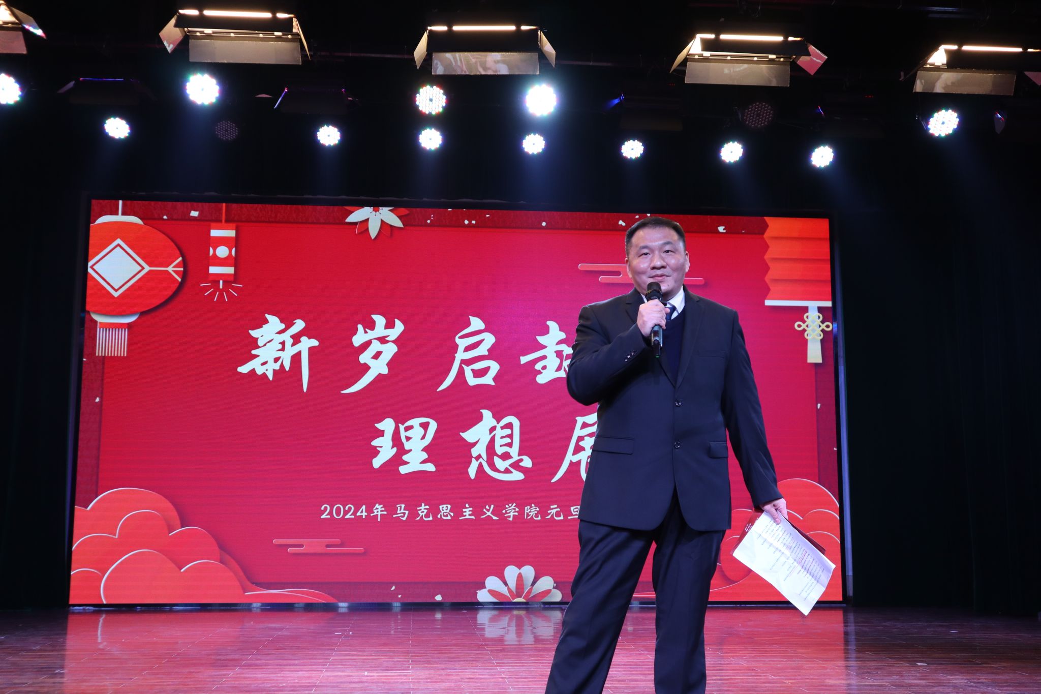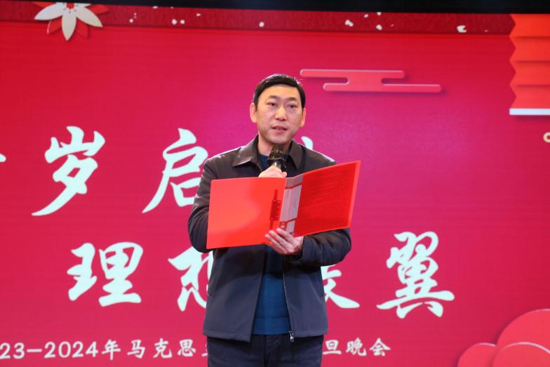 晚会开始前,院长阮一帆致以新年贺词总结2023年马克思主义学院成就,展现马院担当,深入开展理论宣讲,科学研究硕果累累,学院治理能力和体系稳步推进,基层组织和功能逐步凸显,展望2024将是马院人奋斗收获的新篇章。