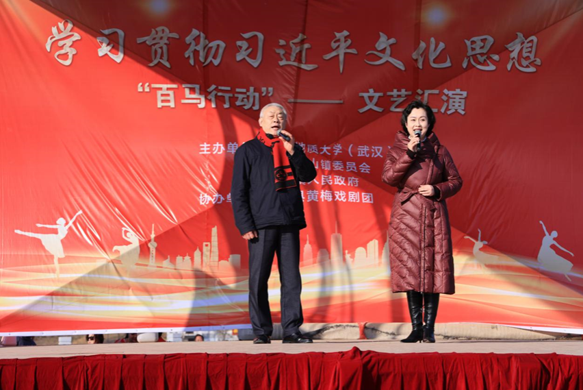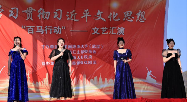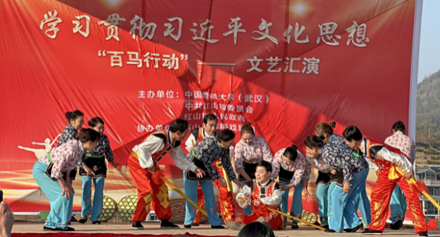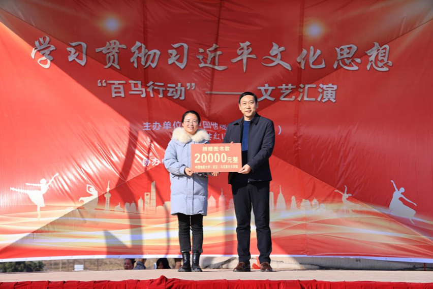 1月5日下午,学习贯彻习近平文化思想“百马行动”文艺汇演在红山镇乌云山村举行。由乌云山村村民带来精彩的开场舞表演,拉开本次文艺汇演的帷幕。在热闹的开场舞之后,由中国地质大学(武汉)马克思主义学院院长阮一帆教授代表我校进行图书款捐赠活动。
