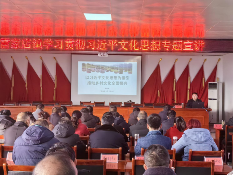 马克思主义学院副院长李海金教授赴雷家店镇开展理论宣讲活动。雷家店镇镇直单位负责人、32个村主要干部参加宣讲会。李海金教授以“以习近平文化思想为指引推动乡村文化全面振兴”为题,围绕充分认识习近平文化思想的重大意义、充分领会习近平文化思想的重大战略、充分把握习近平文化思想的科学方法论三个方面,并结合两个全国典型案例,深刻阐释了习近平文化思想的深刻内涵,让基层党员干部对习近平文化思想有了深入的认识和体会。