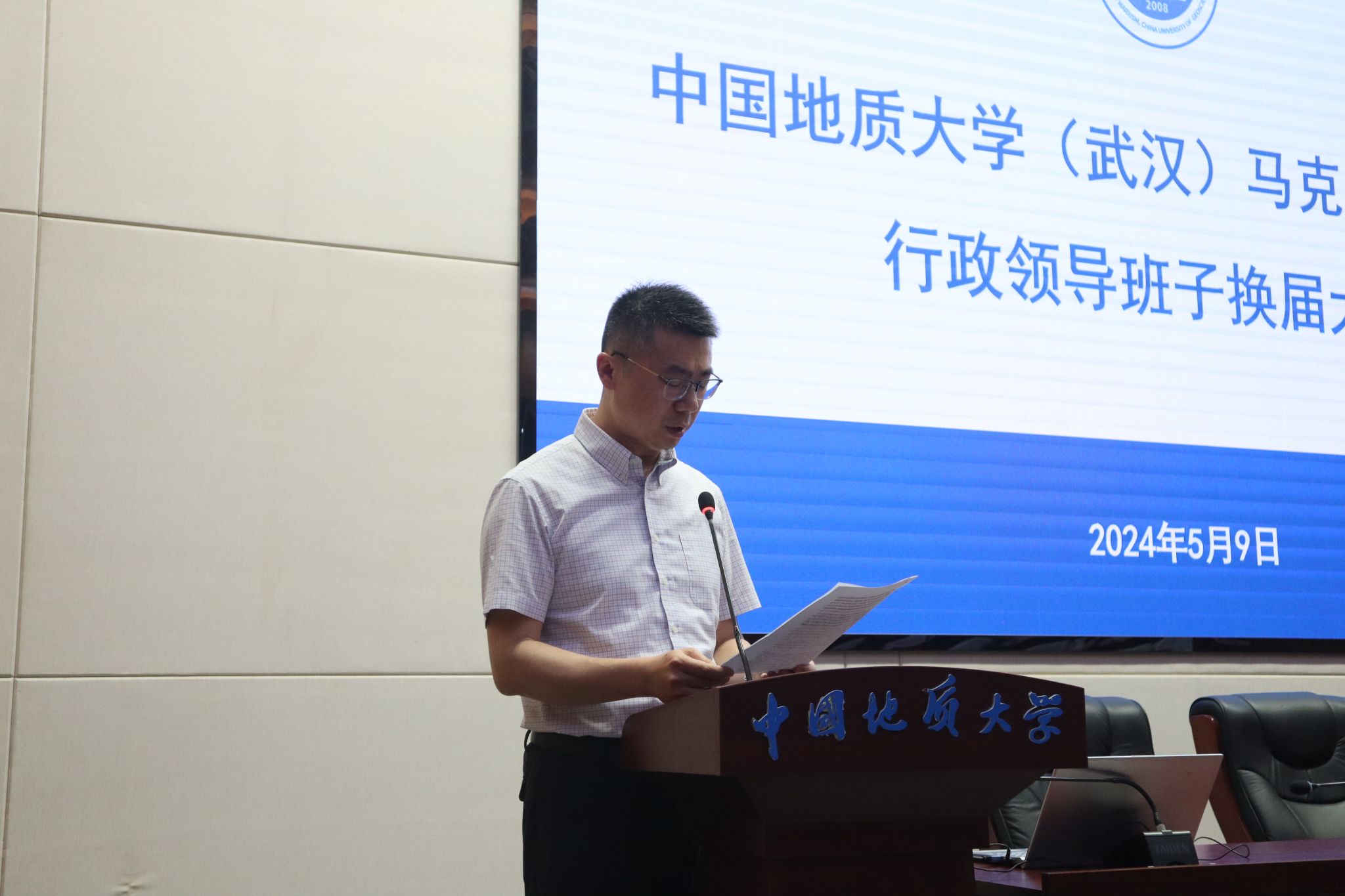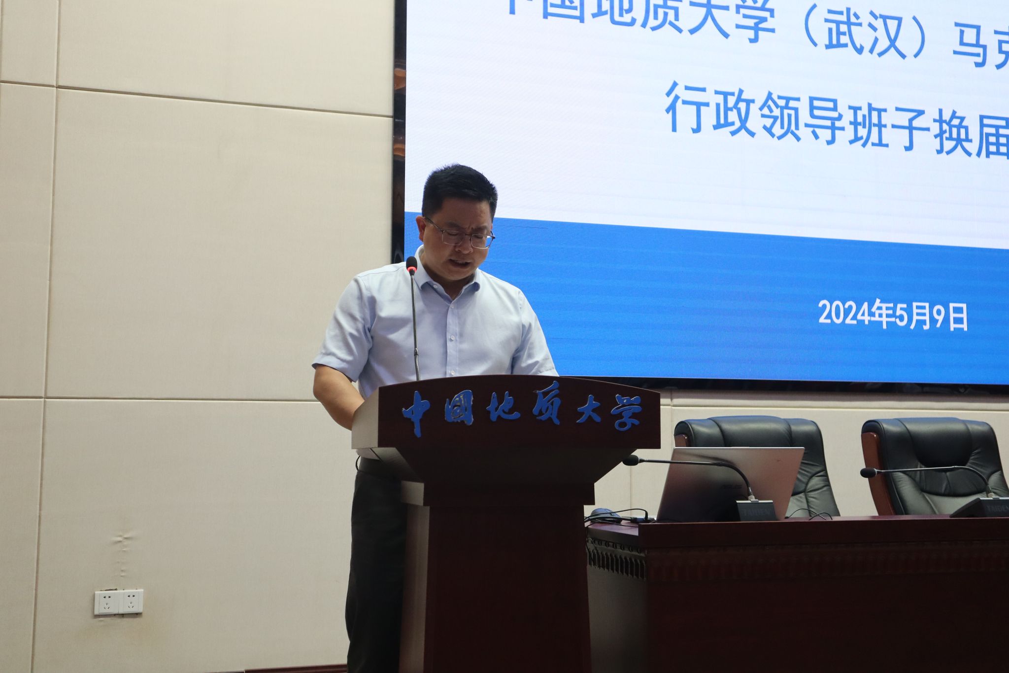 陈文武部长宣读《关于同意马克思主义学院行政领导班子换届的批复》、《关于同意马克思主义学院召开行政领导班子换届大会的批复》。